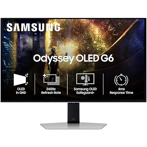 Samsung 27″ (67.8 cm) Odyssey G6 OLED 2K Gaming Monitor|QHD 2560 x 1440|240 Hz|0.03ms| OLED Safeguard+|FreeSync Premium Pro|Nvidia G-Sync|Height-Tilt-Pivot Adjustable Stand|LS27DG610SWXXL|Silver