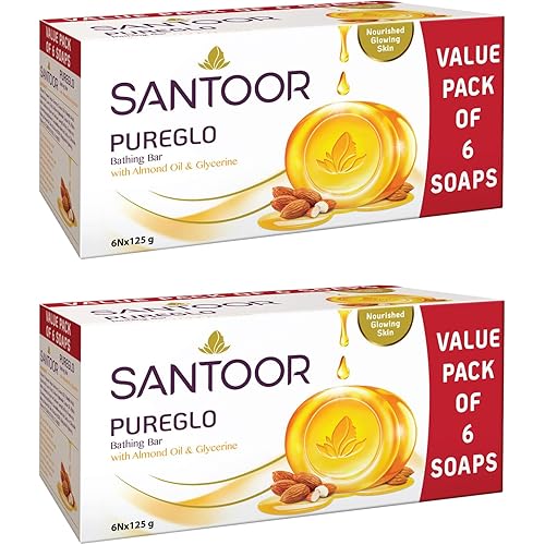 4454 reviews for Santoor PureGlo Glycerine Bath Soap with Almond Oil for moisturized, nourished and shining Skin, Combo Offer 125g Pack of 12