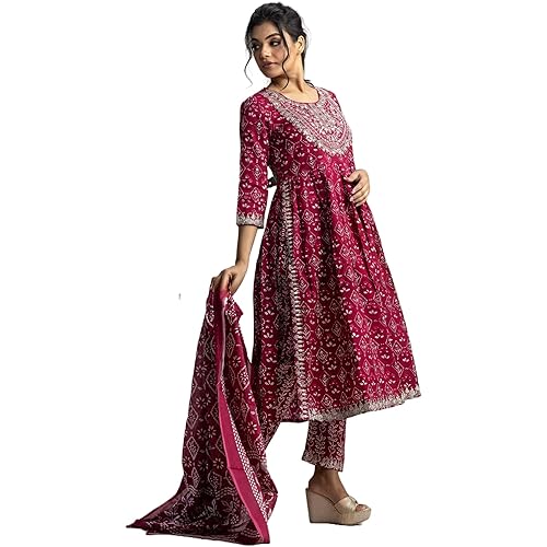 Shantika Women’s Printed Embroidered Rayon Nyra Cut Kurta Pant Set With Dupatta