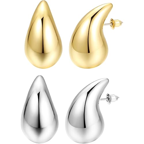 Shining Diva Fashion 2 Pairs Combo Celebrity Inspired Stylish Gold Silver Plated Teardrop Earrings Dupes for Women Girls Teenagers Trending Oversized Lightweight Statement Waterdrop Earrings