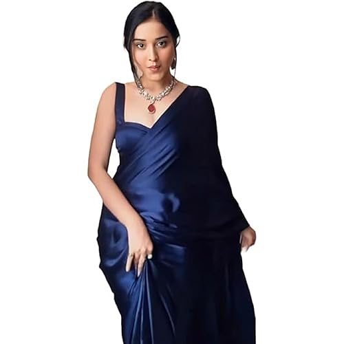 96 reviews for SHOPAZ Women’s Ready to Wear Plain Navy Blue Satin Silk 1 Minute Pre Pleated Saree With Unstitched Blouse