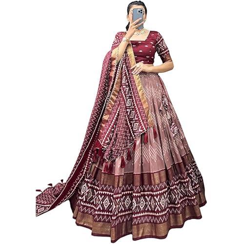 shree crialion Women’s Trending Designeer Tussar Silk Lehenga Choli Print with Foil Work With Unstitched Blouse Patola Print Adorned with Foil Work For Navrati || Wedding