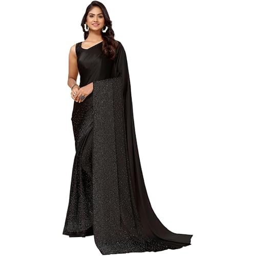 SIRIL Women’s Satin Silk Hot Fixing Stone Work Saree with Unstitched Blouse