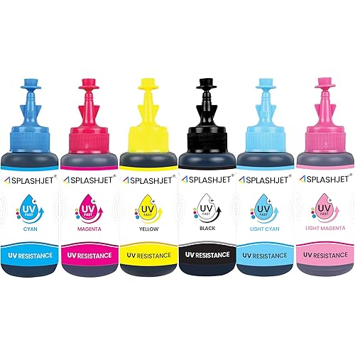 Splashjet T673 UV Plus Refill Ink for Epson Epson L805, L800, L1800, L810, L850 Printer – Compatible Ink Bottle for Epson T673 Ink Code (70gm x C/M/Y/Bk/LC/LM) Set – 504520