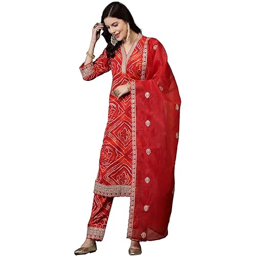 35 reviews for Stylum Silk Blend Women’s Bandhani Print & Embroidered Muslin Straight Kurta Pant With Dupatta Set (Kpdredbanno)