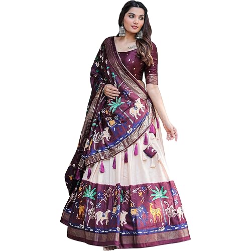 15 reviews for Swara’s Shop Women’s Tussar Silk With Patola Print And Foil Work Lehenga choli (WINE1)