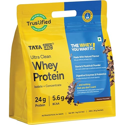 43536 reviews for Tata 1mg Ultra Clean Whey Protein Isolate + Concentrate – Hazelnut Chocolate 1kg | 24g Protein, 5.6g BCAA & 30B CFU Probiotics-28 Sachets