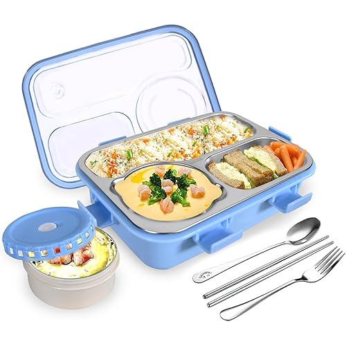 4351820 reviews for TEC TAVAKKAL Lunch Box 3 Compartment Leak-Proof BPA Free Stainless Steel, Lunch Box for Kids, Lunch Box for School & Office with a Fork, a Spoon and a Pair of Chopsticks (Blue), 750 ml