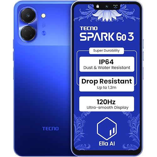 5051 reviews for Tecno Spark GO 3 (Galaxy Blue, 4GB+64GB | Super Durability Drop Resistant & IP64 Rated | Make Calls Without Network* |Ella Al in Your Own Language | Super Smooth 120Hz 6.74″ Display |5000mAh Battery