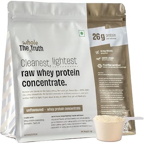 The Whole Truth Whey Protein Concentrate Unflavoured |1 kg (2.2 lbs) | 26g Protein per scoop | 6.4g BCAA | 100% Authentic Whey & No Adulteration | Clean and Light | Muscle Building | Vegetarian
