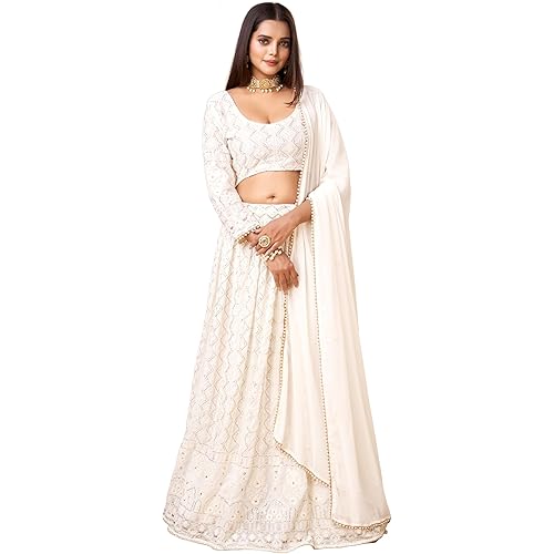 Material: Lehenga Blouse Dupatta: Georgette; Inner: Micro Silk Color: Lehenga: White; Blouse: White; Dupatta: White Measurements: Lehenga Flair: 2.80 Mt, Height: 1.10 mt ||Blouse Size: 1 Mt, Dupatta Length: 2.25 Mt Work: Embroidery,Sequnce Work Packa… read more