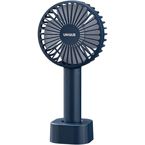 486 reviews for UN1QUE Mini Portable Hand Fan – Powerful Brushless Motor Small Fan, 3-Speeds, USB Rechargeable Fan with Base for Travel, Office, Kitchen, Face Makeup and Outdoor Use – For Women and Men (Navy Blue)