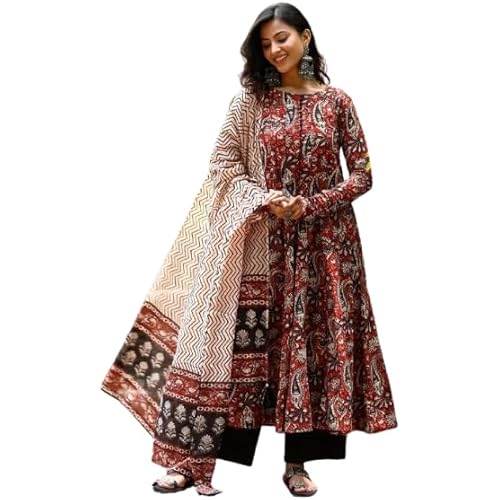 Vidusha Women’s Floral Printed Kurti Pant Set with Dupatta, Maroon and Black Traditional Ethnic Wear For Women’s