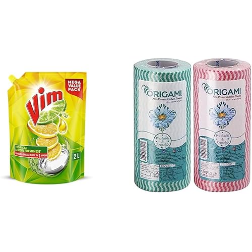 Vim Dishwash Liquid Gel Lemon Refill Pouch, 2 Ltr + Origami Non Woven Reusable Kitchen Towel Roll – Pack of 2 (80 Pulls Per Roll, 160 Sheets)