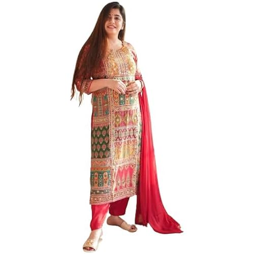Vivaah VASTRAM Women’s Beautiful Printed Muslin with Full Sequence Work Kurta Pent with Dupatta Set Size
