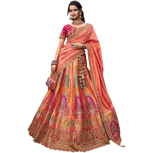 Women’s Astonishing Peach Zari Weaving Banarasi Silk Wedding Lehenga Choli