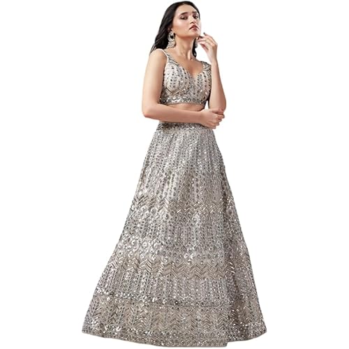 Women’s Beige Net Mirror and Sequins Embroiderey Semi-Stitched Lehenga choli