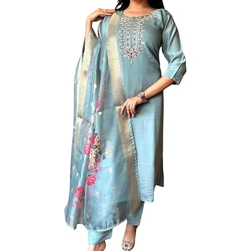 9 reviews for Women’s Embroidered Silk Kurta Set with Dupatta, Light Blue Floral Print, 3/4 Sleeve