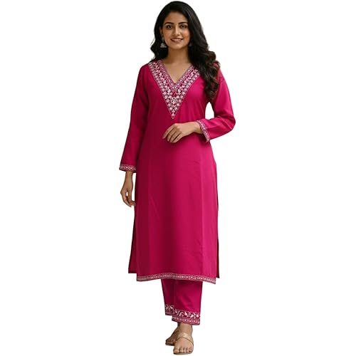 Women’s Embroidered Wool Kurta Set with Pants, Traditional Brown Indian Ethnic Wear with V-Neck Design, Full Sleeves