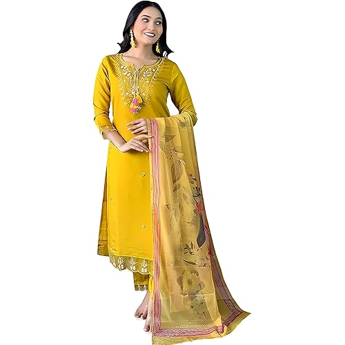 239 reviews for Naixa Women’s Mustard Chanderi with Cotton Lining Embroidered Straight Kurta with Chanderi Silk Pant and Crep Silk Printed Dupatta Sets