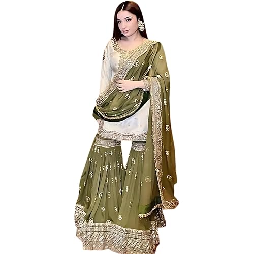 41528 reviews for Women’s Off-White Embroidered Kurta with Green Sharara & Dupatta Set – 3/4 Sleeve, Round Neck, Above Knee Length | Party | Wedding