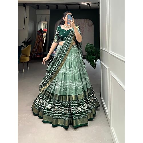 2 reviews for Women,s Tussar Silk With Leheriya And Foil Print Lehenga choli Set (GREEN)
