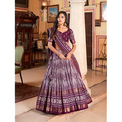 Women,s Tussar Silk With Leheriya And Foil Print Lehenga choli Set (WINE)