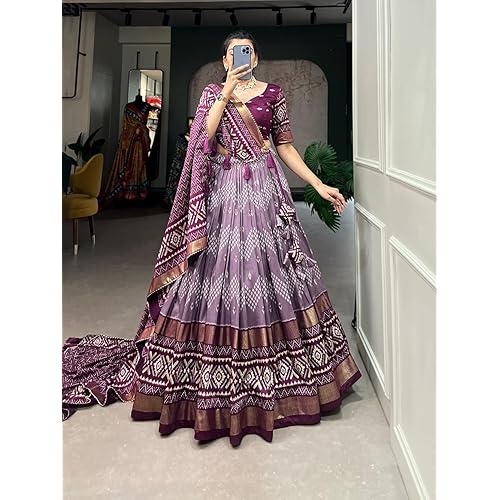 33 reviews for Women,s Tussar Silk With Leheriya And Foil Print Lehenga choli Set (WINE1)