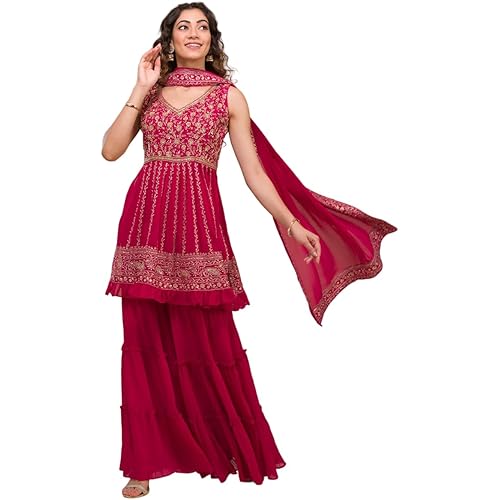 62 reviews for Xomantic Fashion Womens Purple Designer Zariwork Georgette Readymade Sharara Suit