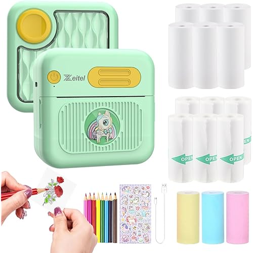 425490 reviews for ZEITEL® Mini Bluetooth Thermal Printer, Portable Label Inkfree Mini Printer for Android & iOS System, Black on White Thermal Printer with 15 Rolls of Print Paper, 8 Colors of Pencils, Stickers, Green