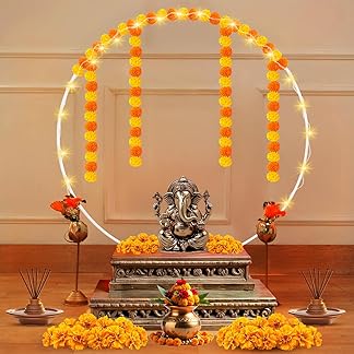 Party Propz Circular Pooja Backdrop Stand for Decoration – 5Pcs Ganpati Decoration Setup for Home, Ganpati Backdrop Decorations Set with Artificial Marigold Flowers and Fairy Light, GanDecorations