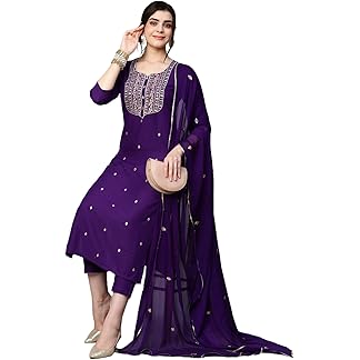 INDO ERA Women’s Embroidered Viscose Calf Length Straight Kurta Pant Set With Dupatta