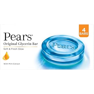 Pears Original Glycerin Soap Bar – Soft & Fresh Glow | With 98% Pure Glycerin & Mint Extract | For a Fresh Glow | With Plant Based Cleanser for Skin & Body | Paraben-free | 125gms x 4
